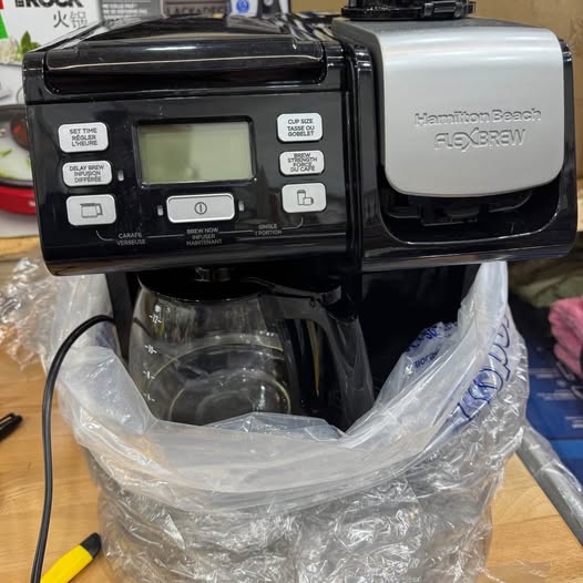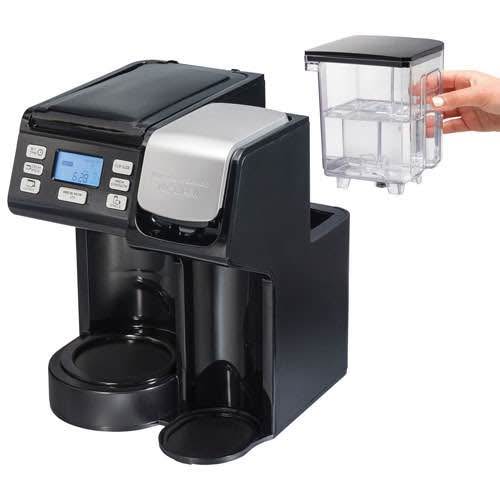 Hamilton Beach FlexBrew Trio Coffee Maker - 12-Cup - Black/Silver With the Hamilton Beach FlexBrew Trio coffee maker, your mornings just got a lot easier. Brew a single six to 14-ounce cup of coffee with a pod or coffee grounds in about 90 seconds, or brew a 12-cup carafe for the whole family to enjoy. You can even take advantage of the Easy-Touch programming to set automatic brewing for busy mornings. Three ways to brew for incredible versatility, including single-serving from a pod, single-serving from coffee grounds, and carafe brewing 90-second single-cup brewing gets you your morning coffee quickly Brew single-servings at regular or bold strengths from a coffee pod or coffee grounds to customize your beverage to your taste Generous 56-ounce water reservoir lets you brew up to seven cups of coffee without needing a water refill Carafe has a 12-cup capacity and regular or bold strength options, perfect for brewing customized coffee beverages for a crowd Backlit digital display with clock keeps you on track in the mornings Easy-Touch programming lets you set the machine to automatically brew at a specific time, allowing you to wake up to hot, fresh coffee Width 28.2 cm Height 34.29 cm Depth 31.24 cm Width (Inches) 11.1 in Height (Inches) 13.5 in Depth (Inches) 12.3 in